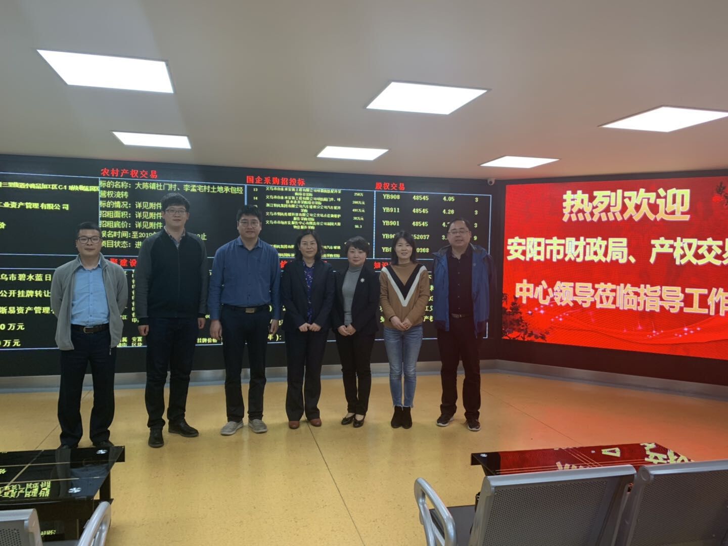 4月10日,安阳市财政局及产权交易中心领导莅临义乌产权交易所参观指导国有产权交易工作,产权交易所总经理赵秋明、副总经理赵建文等陪同。