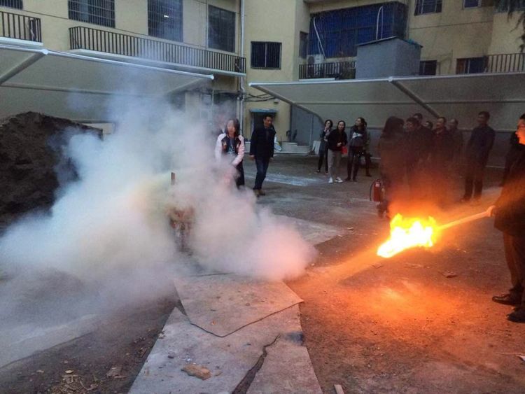 消防安全培训结束后,全体人员来到公司后院,在教官的指导下依次使用灭火器进行灭火。